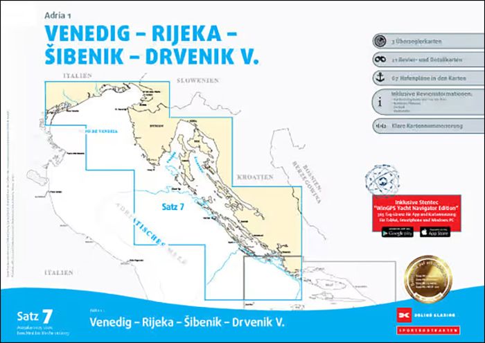 Der Satz 7 der Delius Klasing Sportbootkarten enthält 3 Überseglerkarten sowie 25 Revier- und Detailkarten zur Navigation an der Adriaküste von Venedig über Rijeka und Sibenik bis Drvenik V. - inklusive der Inseln.