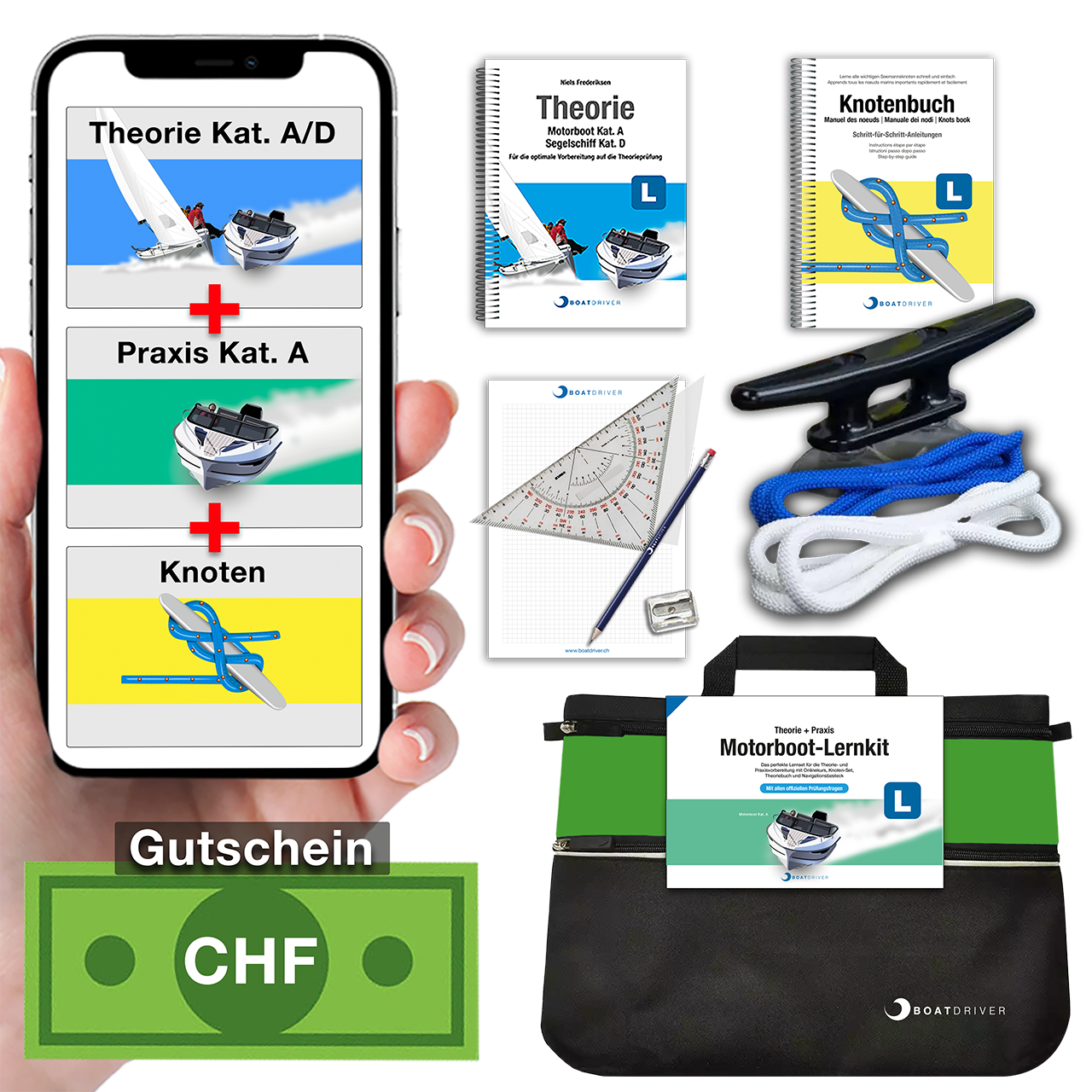 Die Bootsfahrschulen und wir empfehlen das Motorboot-Lernkit. Damit hast du gleich alles, was dich optimal auf die Theorie- und Praxisprüfung vorbereitet. Den Prüfungserfolg garantieren wir dir, sonst erhältst du dein Geld zurück!