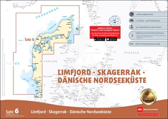 Der Satz 6 der Delius Klasing Sportbootkarten enthält 4 Überseglerkarten sowie 22 Revier- und Detailkarten zur Navigation auf der dänischen Nordseeküste, dem Limfjord und Skagerrak.